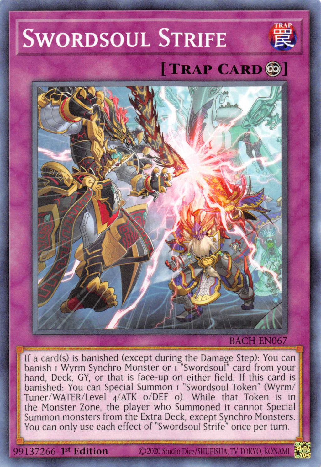 If a card(s) is banished (except during the Damage Step): You can banish 1 Wyrm Synchro Monster or 1 "Swordsoul" card from your hand, Deck, GY, or that is face-up on either field. If this card is banished: You can Special Summon 1 "Swordsoul Token" (Wyrm/Tuner/WATER/Level 4/ATK 0/DEF 0). While that Token is in the Monster Zone, the player who Summoned it cannot Special Summon monsters from the Extra Deck, except Synchro Monsters. You can only use each effect of "Swordsoul Strife" once per turn.