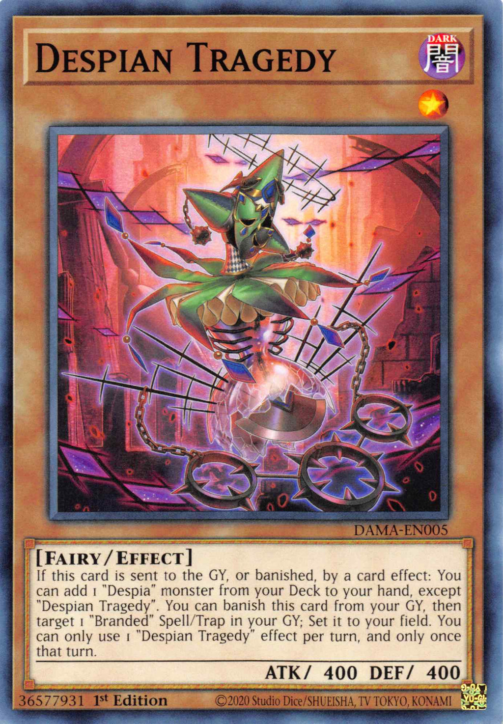 If this card is sent to the GY, or banished, by a card effect: You can add 1 "Despia" monster from your Deck to your hand, except "Despian Tragedy". You can banish this card from your GY, then target 1 "Branded" Spell/Trap in your GY; Set it to your field. You can only use 1 "Despian Tragedy" effect per turn, and only once that turn.